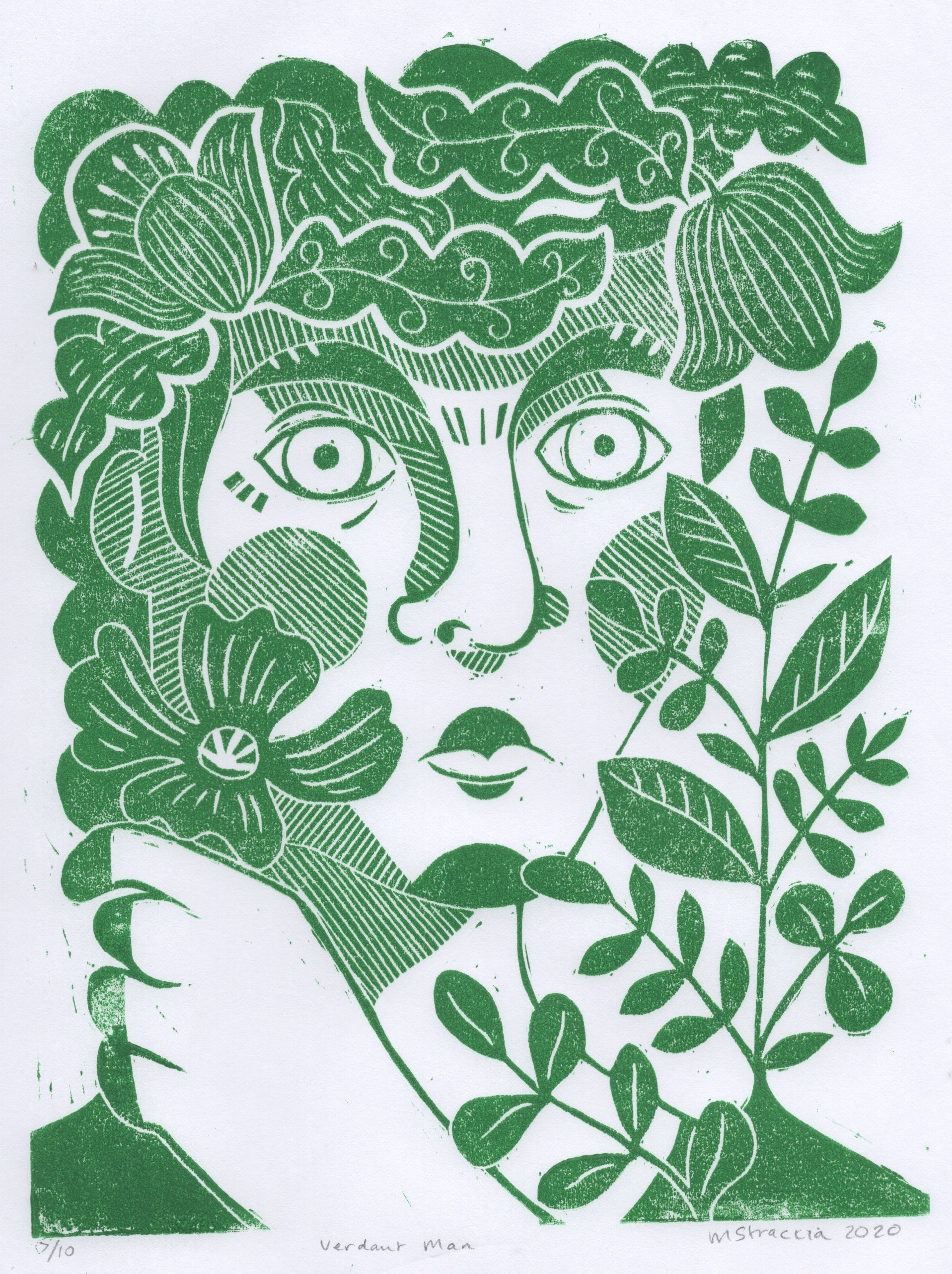 Yup. With the corona virus pandemic, these environmental issues were racing around my head, and it seemed obvious to design my own Verdant Man linoprint using green ink.