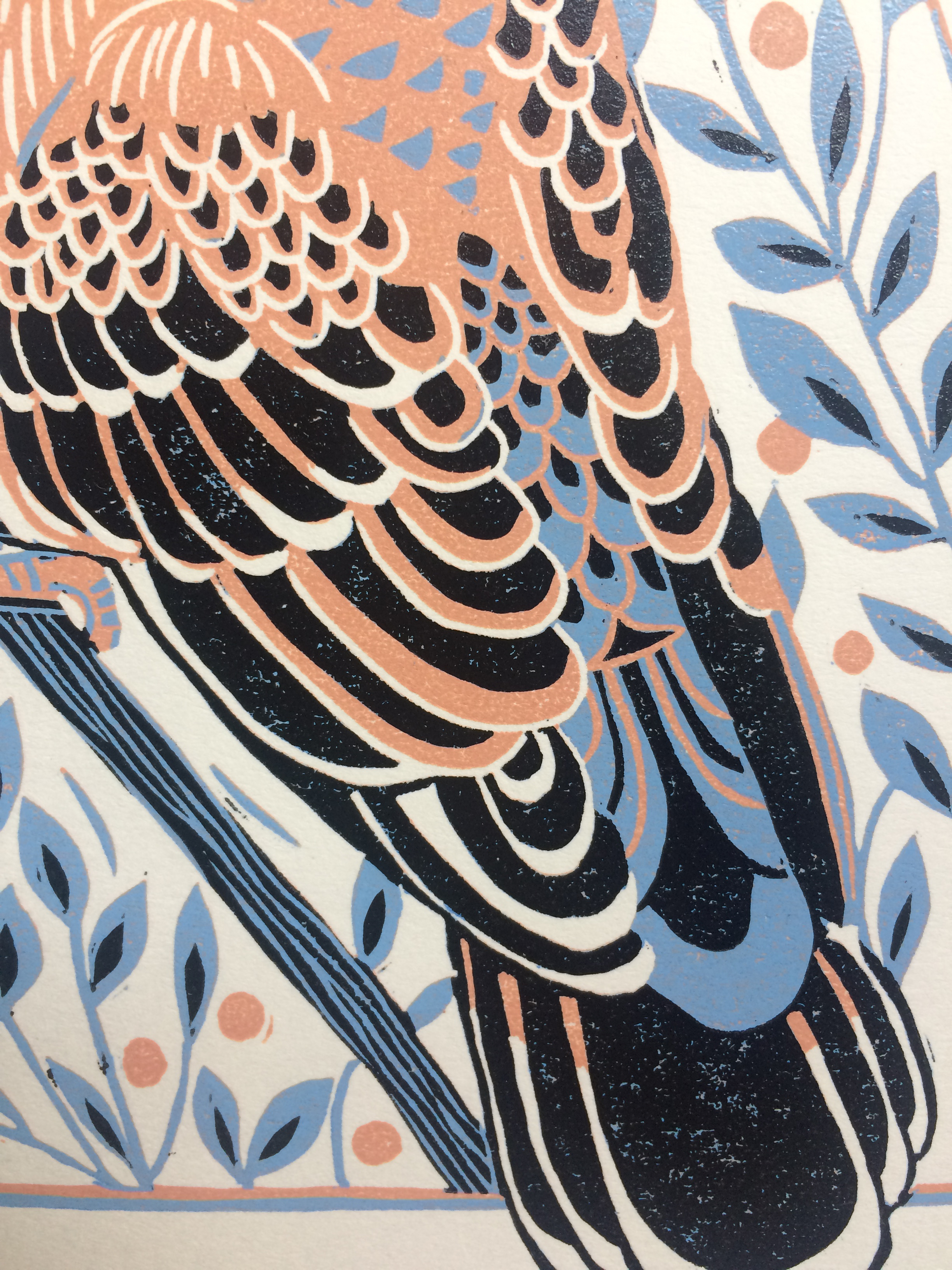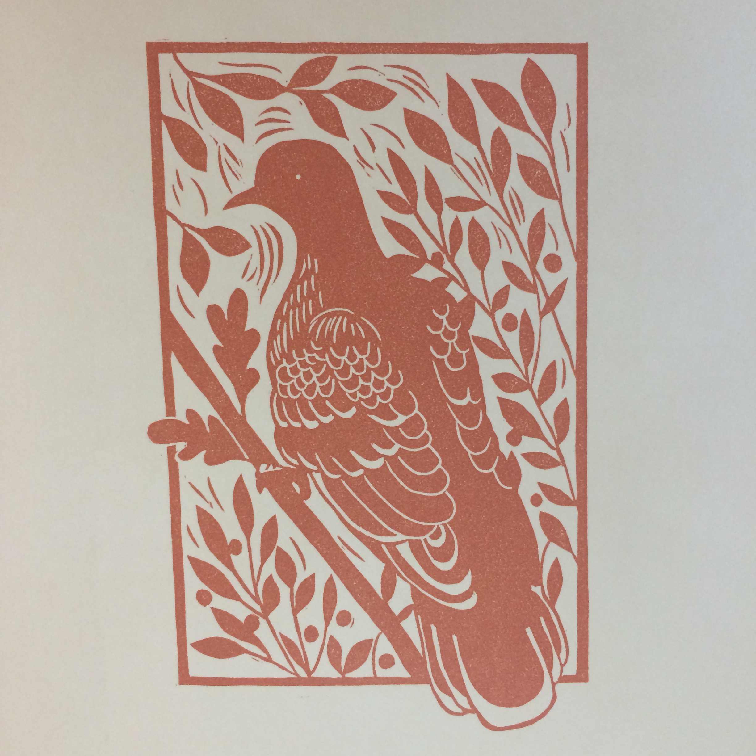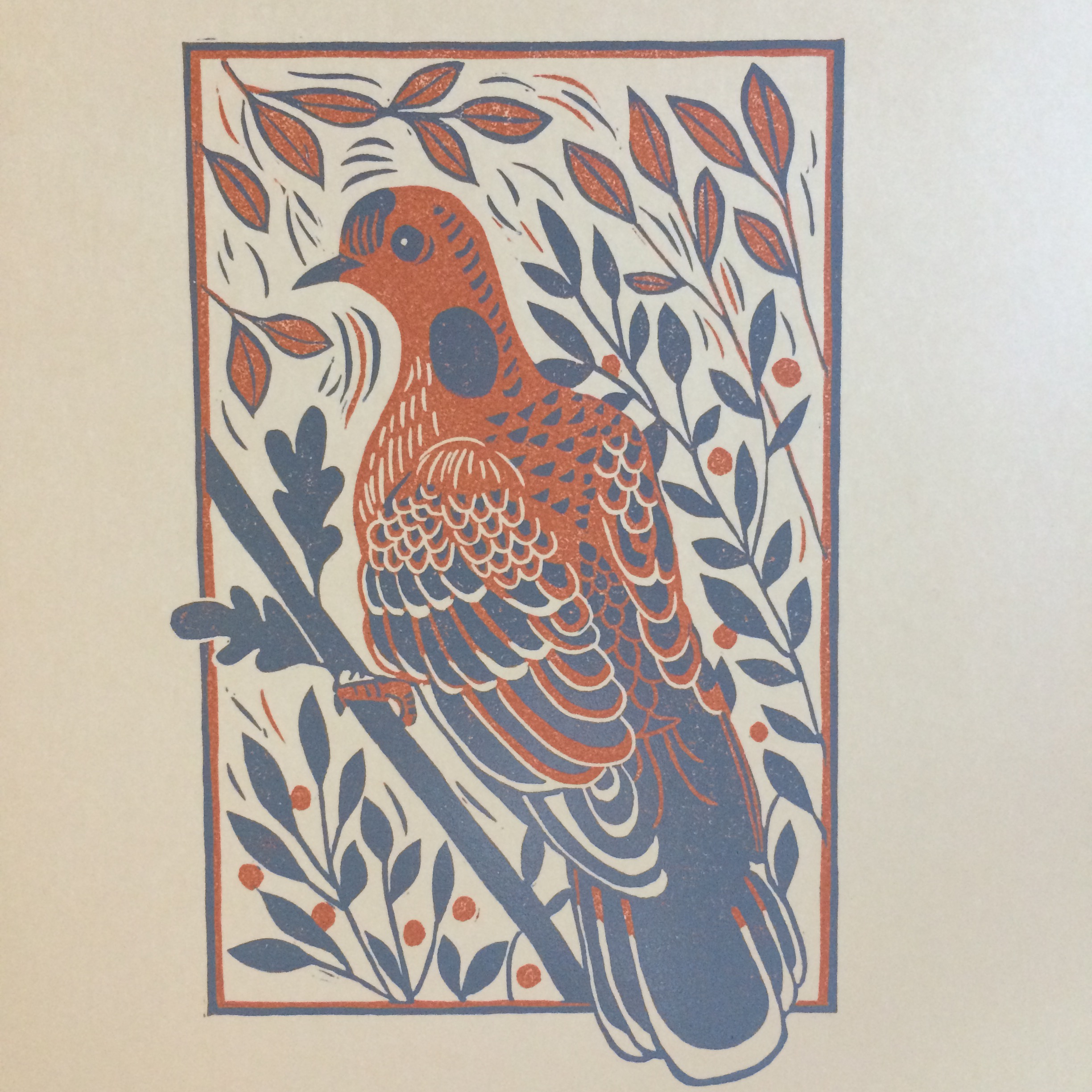This is one of my favourite birds. It has a beautiful purring-like call and it is a gorgeous creature with pretty plumage. I’ve been practising the reduction method of linoprinting where each colour layer is printed from the same piece of lino. The lino is carved away for each layer and colour is added on top of the last (which means I can’t go back to print more). I’ve designed my European turtle dove in a traditional arts and crafts style using beige, blue and black inks. It seemed to work well.