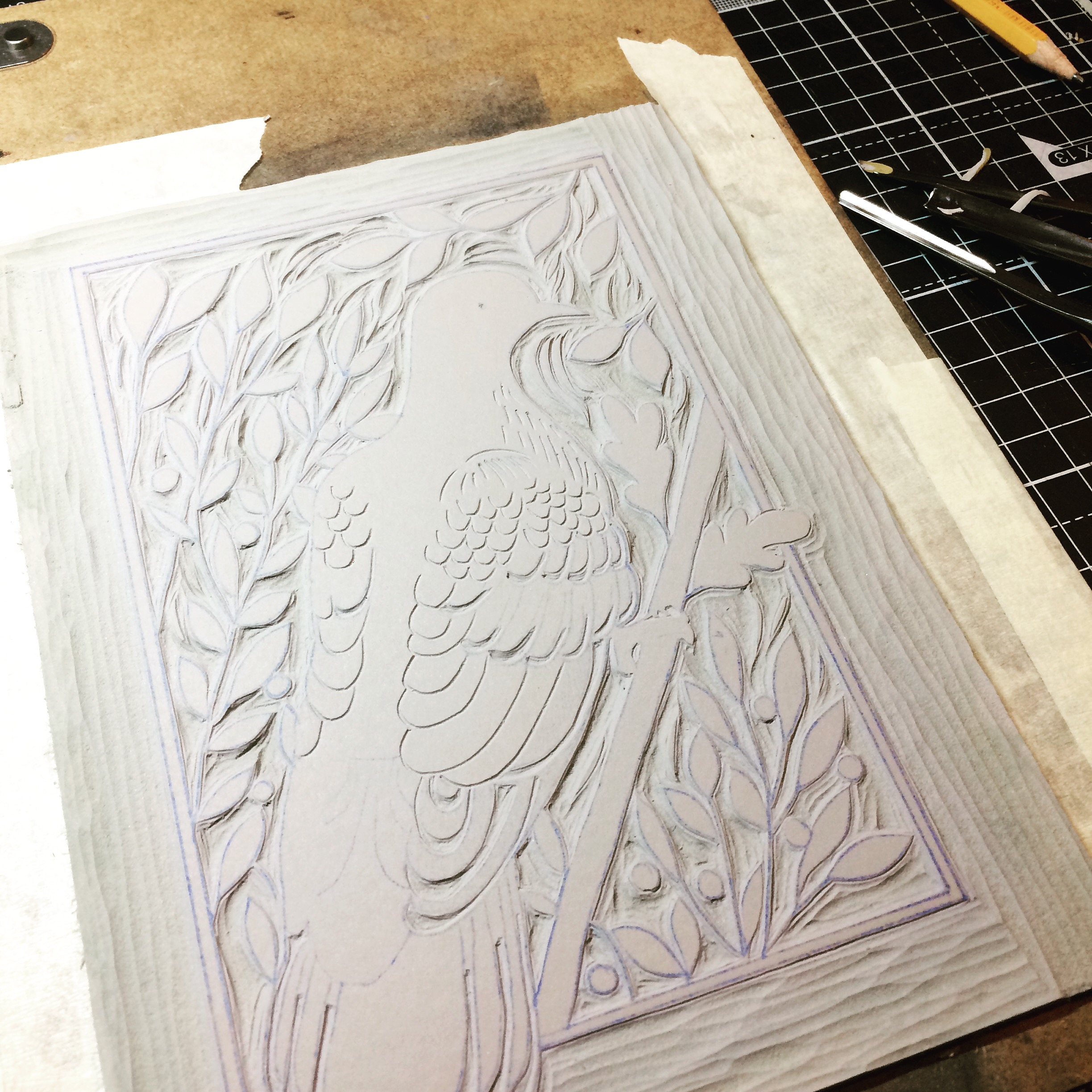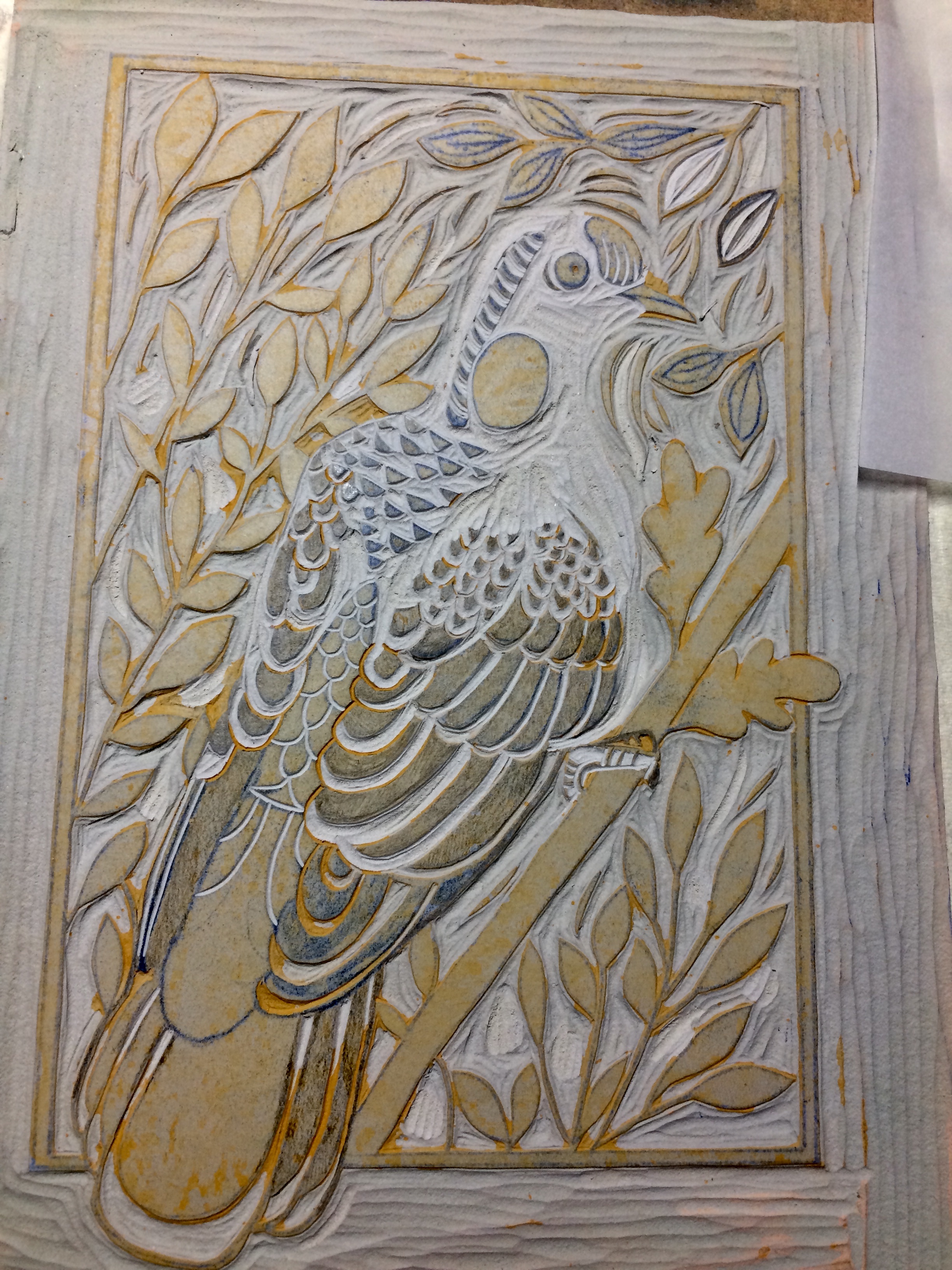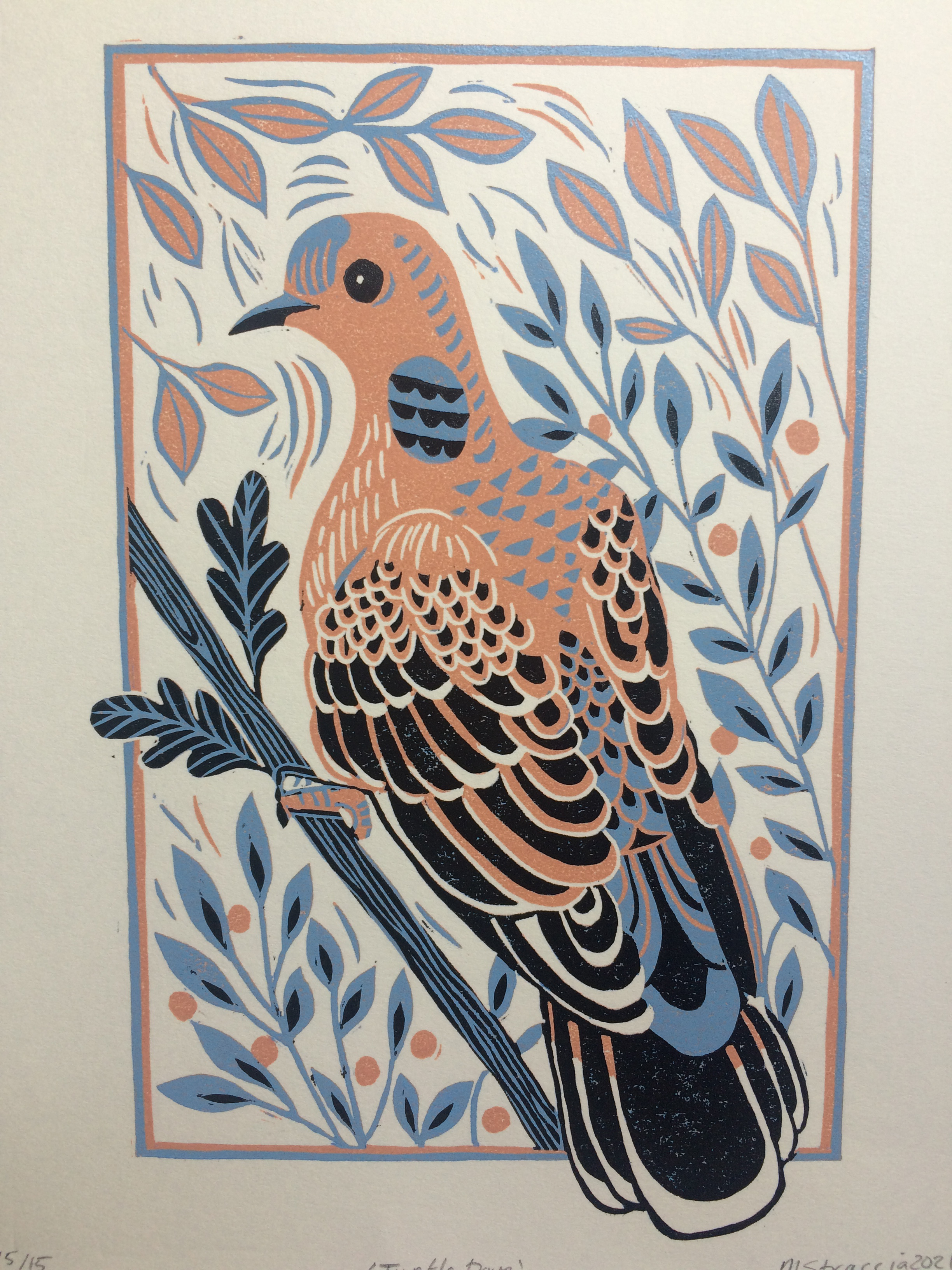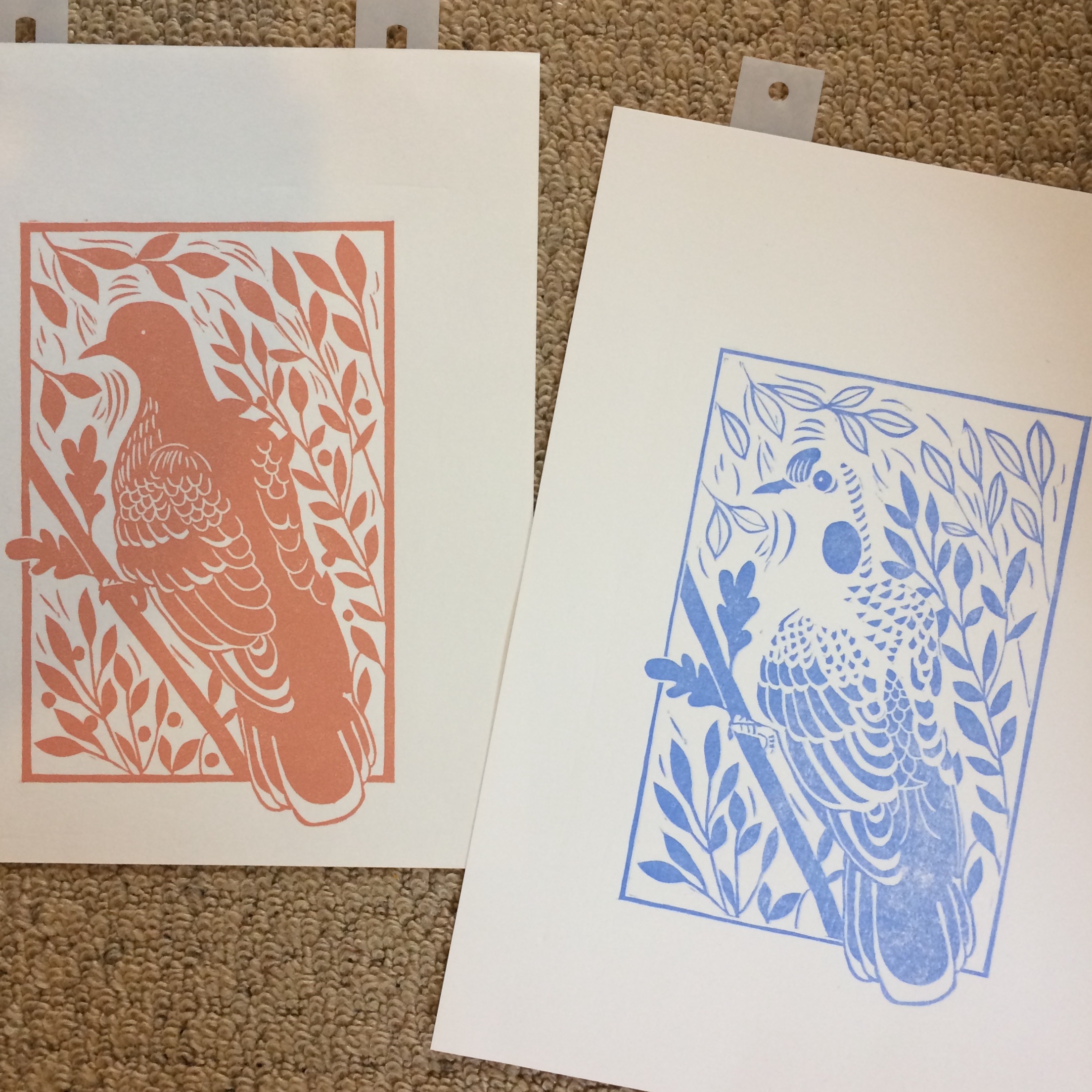 This is one of my favourite birds. It has a beautiful purring-like call and it is a gorgeous creature with pretty plumage. I’ve been practising the reduction method of linoprinting where each colour layer is printed from the same piece of lino. The lino is carved away for each layer and colour is added on top of the last (which means I can’t go back to print more). I’ve designed my European turtle dove in a traditional arts and crafts style using beige, blue and black inks. It seemed to work well.