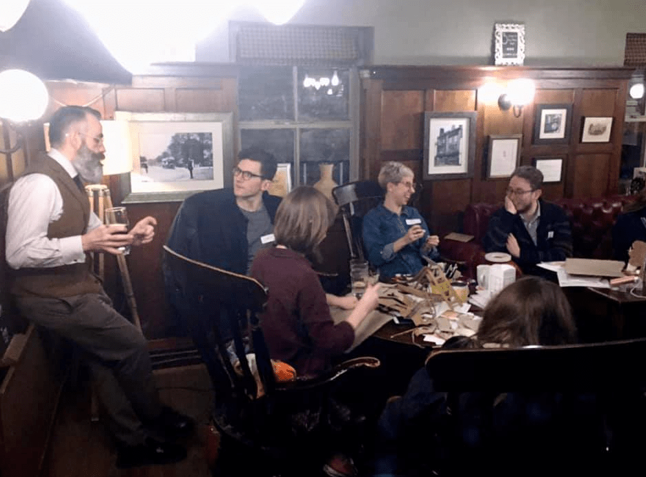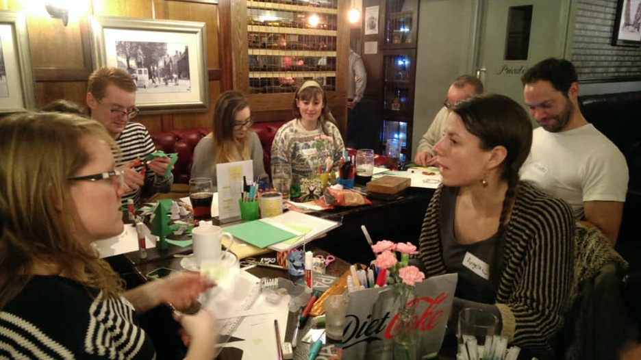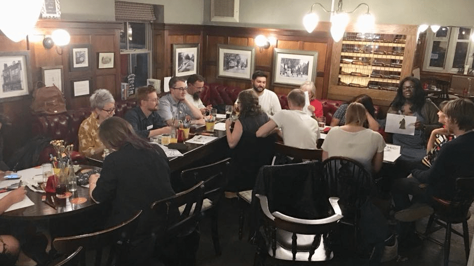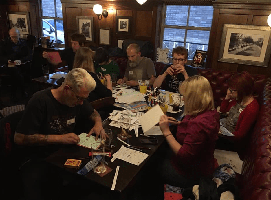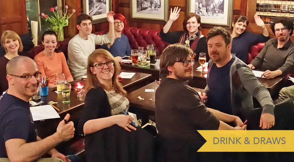 We meet in the pub and draw together. That’s it! It’s free and fun and you get to meet lots of new like-minded people. We welcome everyone, you don’t have to be a professional to join in. We usually have a themed drawing activity to get you started. Sometimes a blank white sheet of paper can be intimidating.