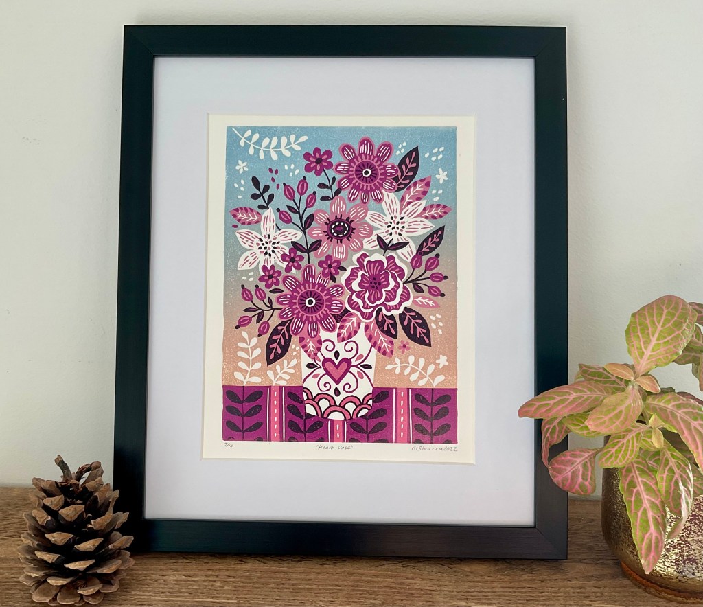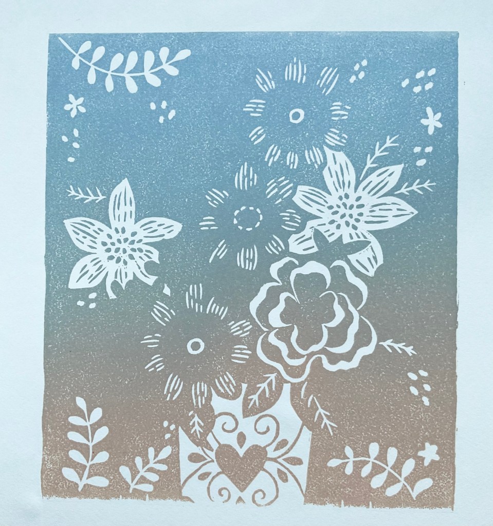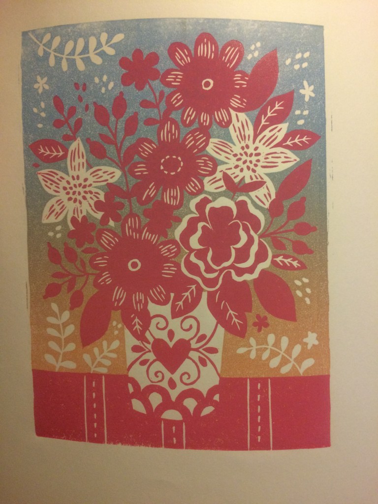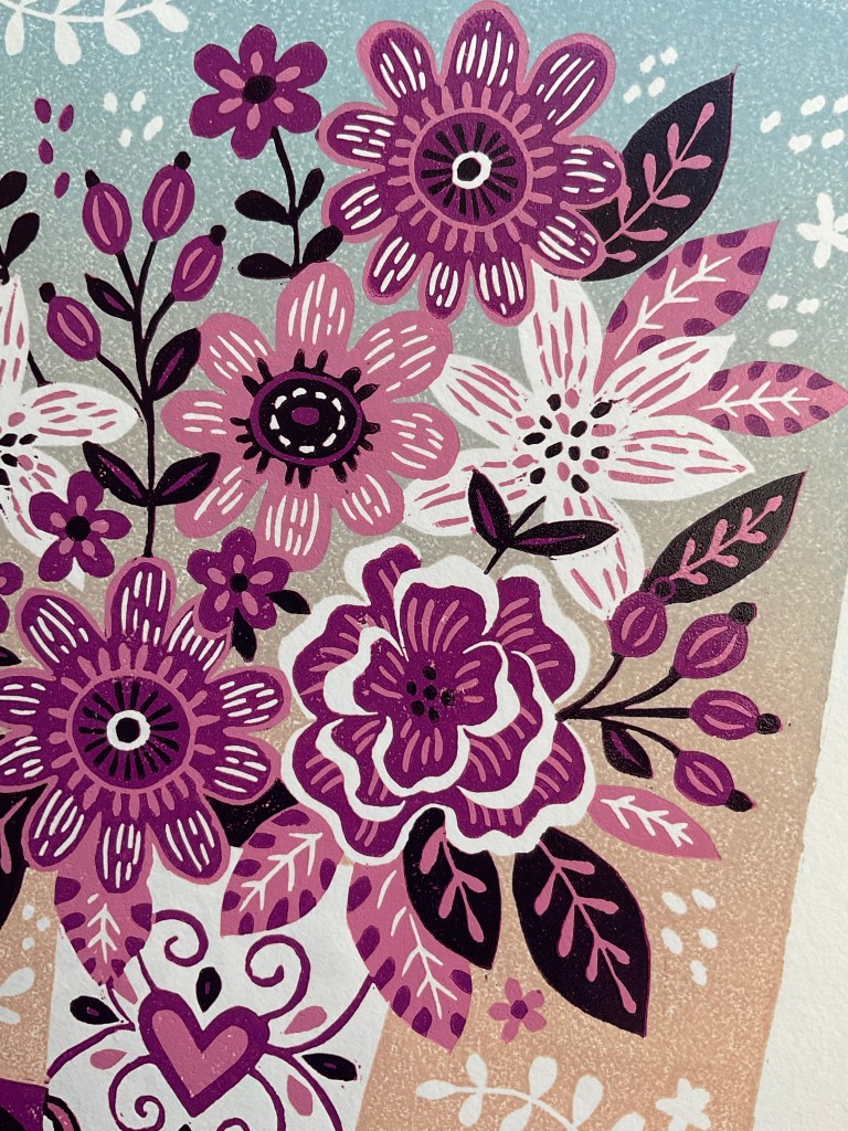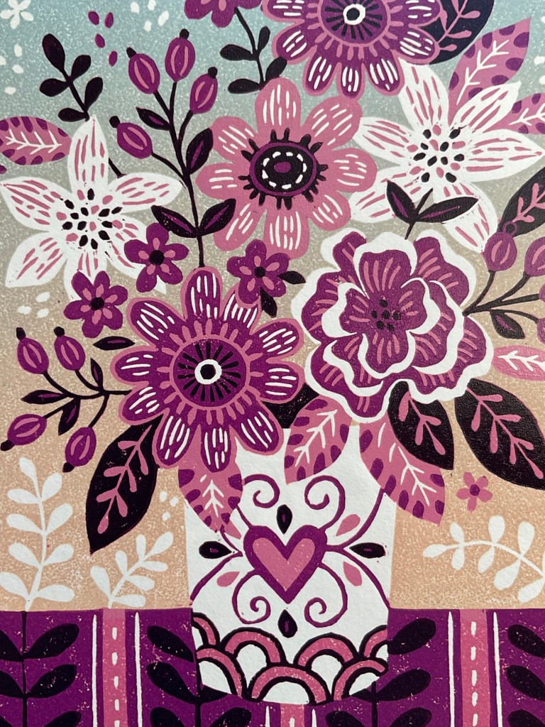 This is a new reduction linocut of some flowers in a vase. It’s soooo bright and colourful. The photo is quite faithful to how the print appears in real life. I’ve mixed my own pinks and purple rather than using pigment straight from the tube. It was so satisfying to do.