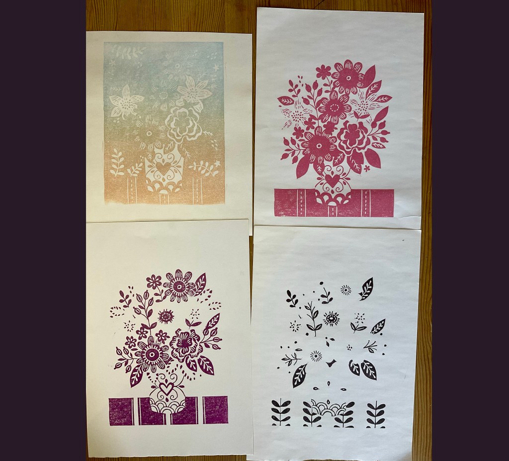 You can see the process in my tests: One piece of lino, and four layers of colour. I managed to get 10 okay prints. They each have their own little variations in texture and markings, because they are each handprinted. The pink and purple are really lush and vibrant, originally I was going to use blue and I am glad I switched to pink.