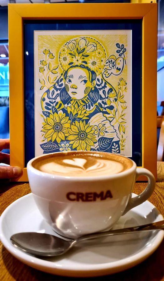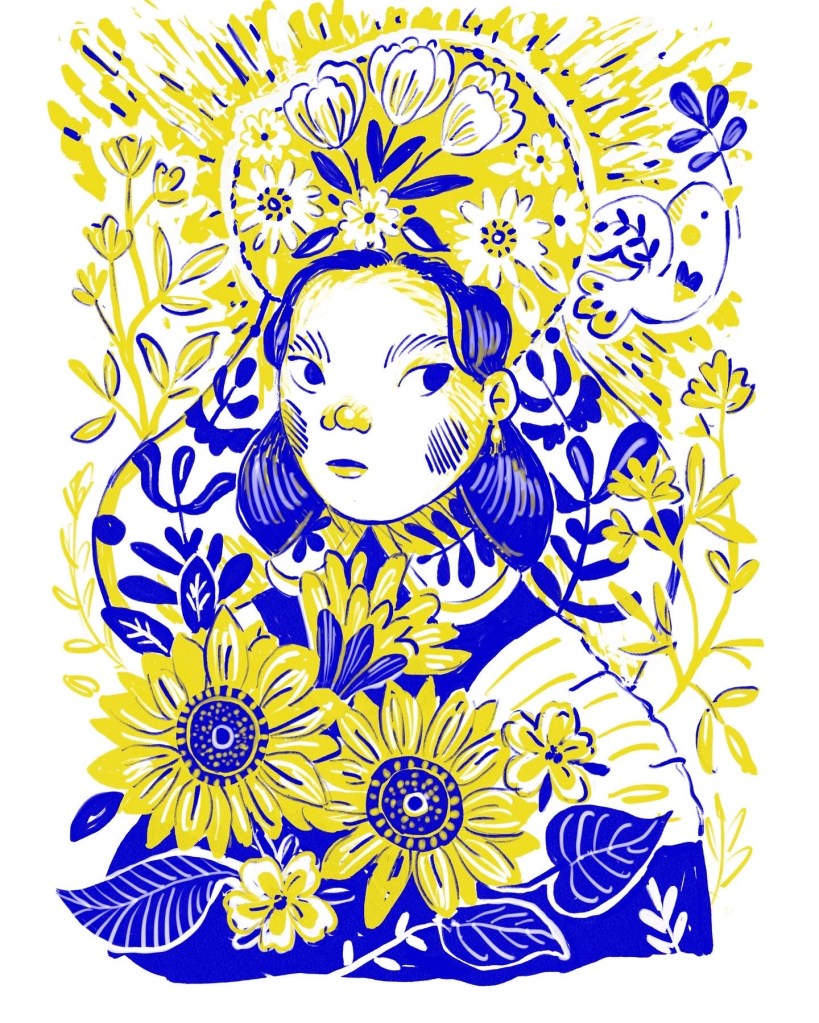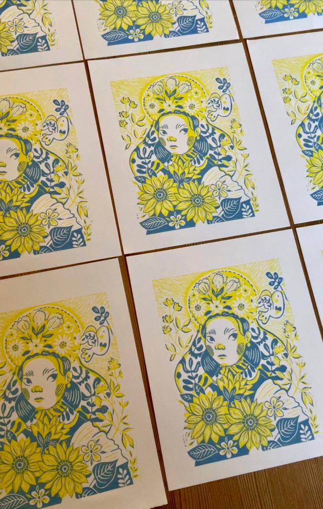 Ukraine’s national motto is ‘Glory to Ukraine’ (Slava Ukraini). The response (and the name of this print) is ‘Glory to the Heroes!’. It’s for the courageous people in Ukraine and the generous people in it’s bordering countries, they are welcoming so many refugees.