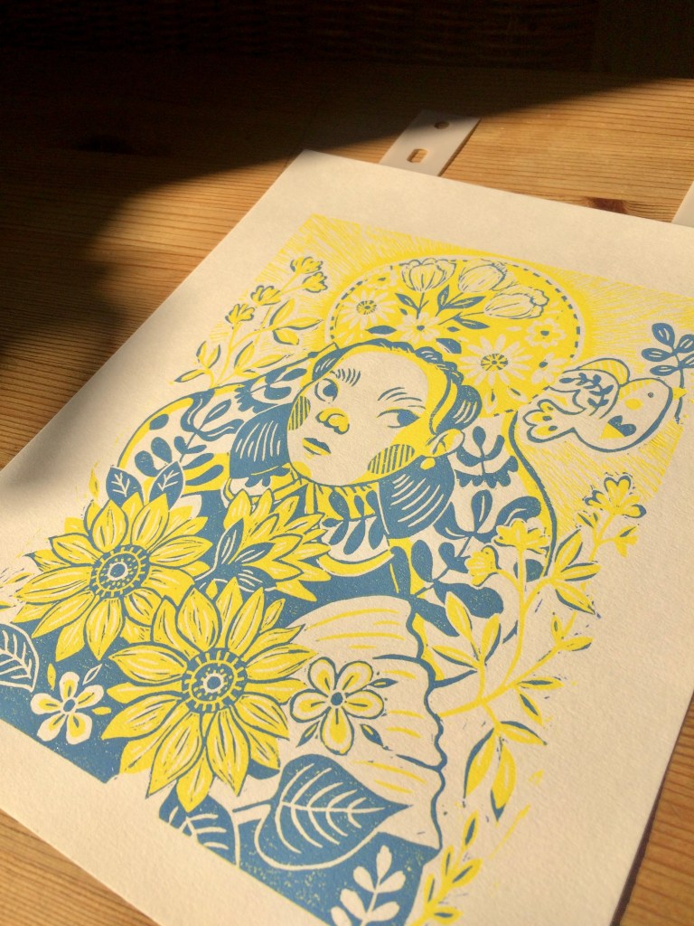 I made a two colour reduction linocut to sell as a fundraiser for the Red Cross Ukraine crisis appeal. I have sold out now, but the money that was donated came to £410. A print was given to anyone who gave money to charity. My target was £300, but people were very generous. Thank you so much, you are amazing.