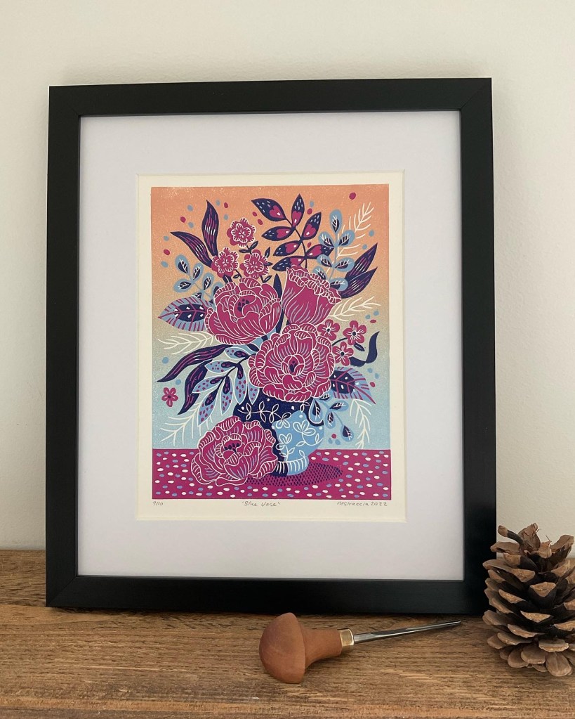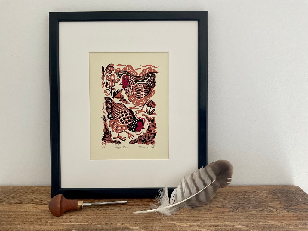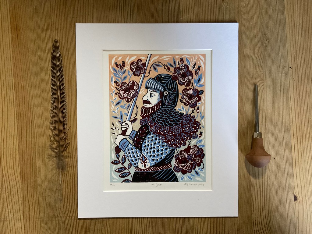 ‘Knight’, ‘Happy Hens’ and ‘Blue Vase’ are reduction linocut prints that I made this year. They are handprinted, made without a press. I burnished them at home using a wooden spoon and a bit of arm muscle!