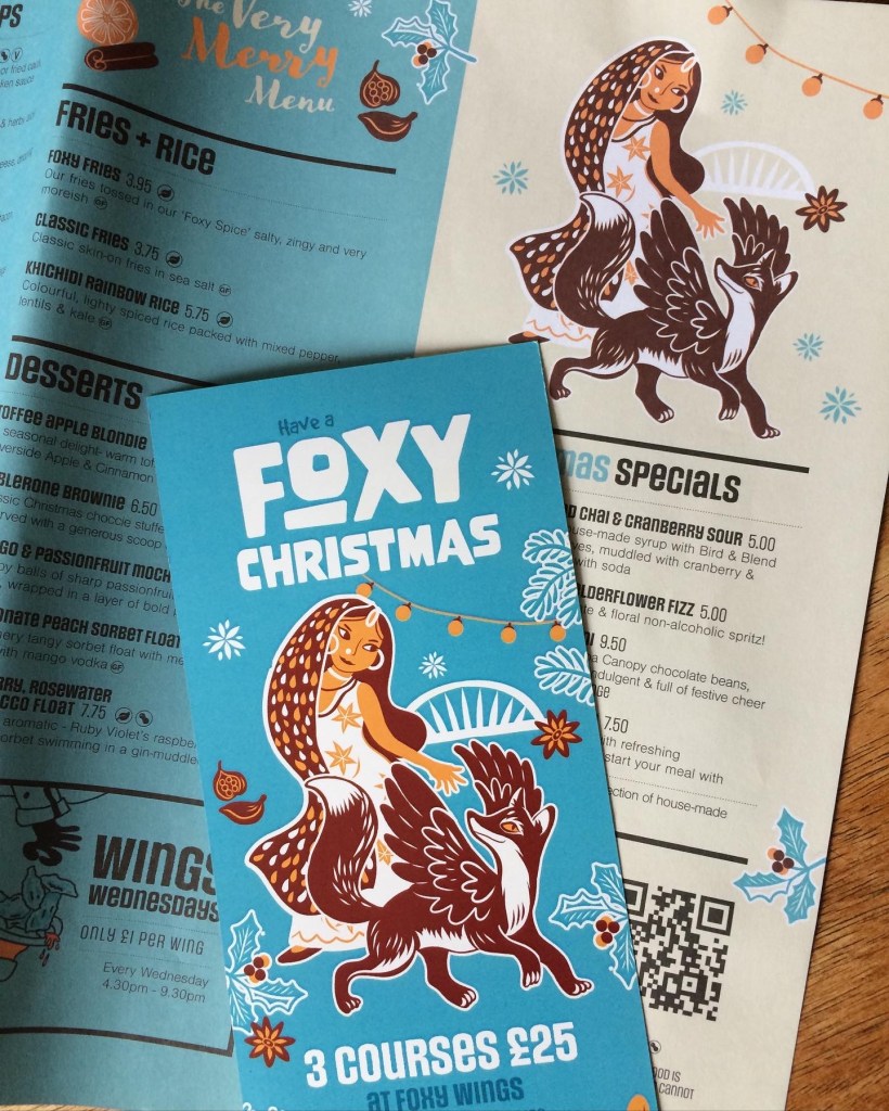 We had a fantastic meal at Foxy Wings last night! Look how excited I am in this pic! I finally got to see my illustrations on their new Christmas menu. Of course, the best thing was actually tasting it!