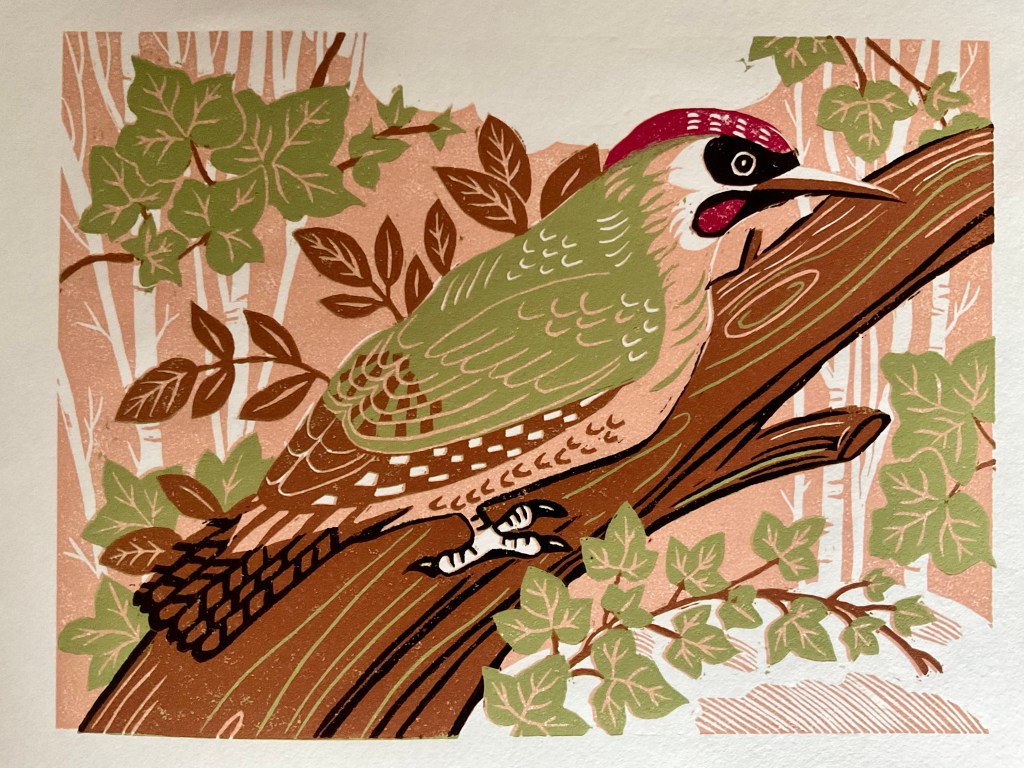 You can’t fixing printing mistakes with reduction printing, so just keep going. I’m glad I did. The green woodpecker isn’t perfect but it is finally finished and I love the feel of this print. I mixed my own colours and I like the vintage traditional style. I hope you do too!
