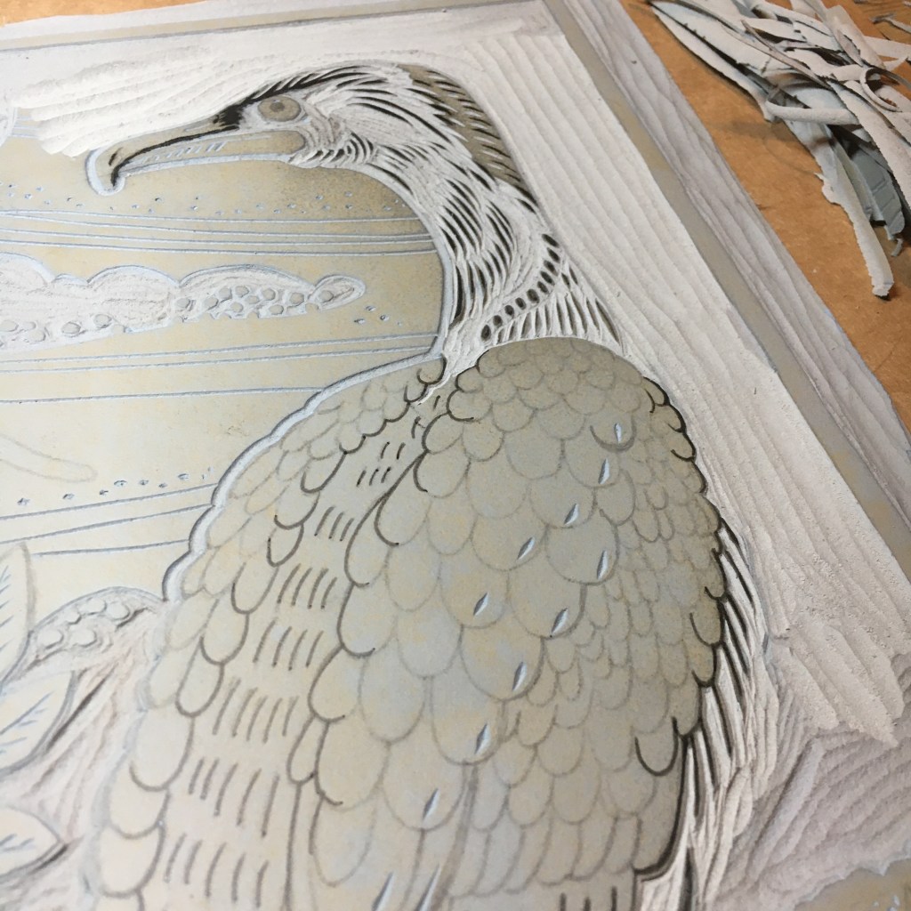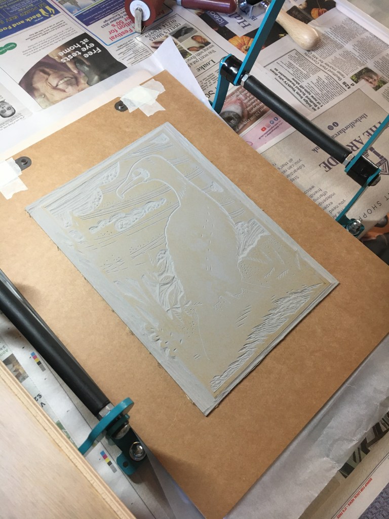 I sketch my design in my sketchbook using watercolour to test colours. Then I use the Fresco app on my iPad to finesse the design. I trace the image onto a piece of lino (I used traditional battleship grey lino). The lino is stuck to a board using carpet tape. I use terne burton pins to achieve a perfect registration.