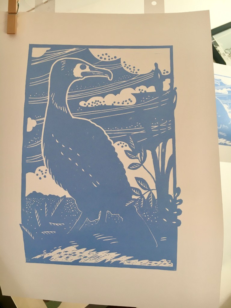 Then I carve away parts of the lino, ink the remaining surface and print a blue layer, then carve away more material, print orange onto the same piece of paper, and then carve away some more, then print the final black layer. Each time a colour is added to my paper it must be in exactly the same place to my lino or the print will be off and all my time will be wasted! Three colours are printed using the same piece of lino.