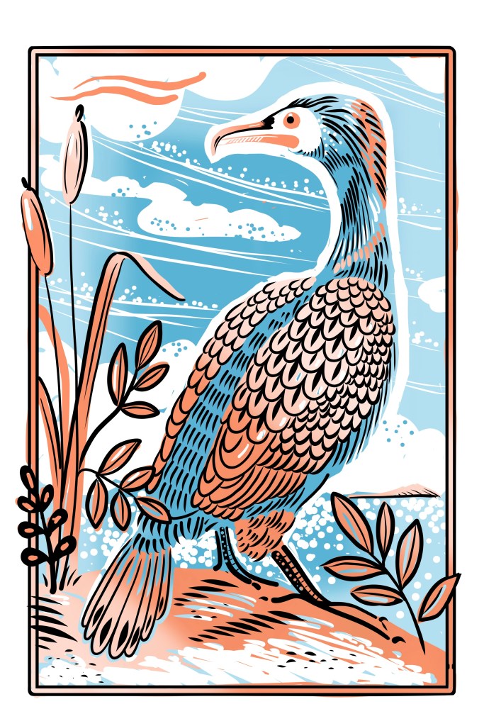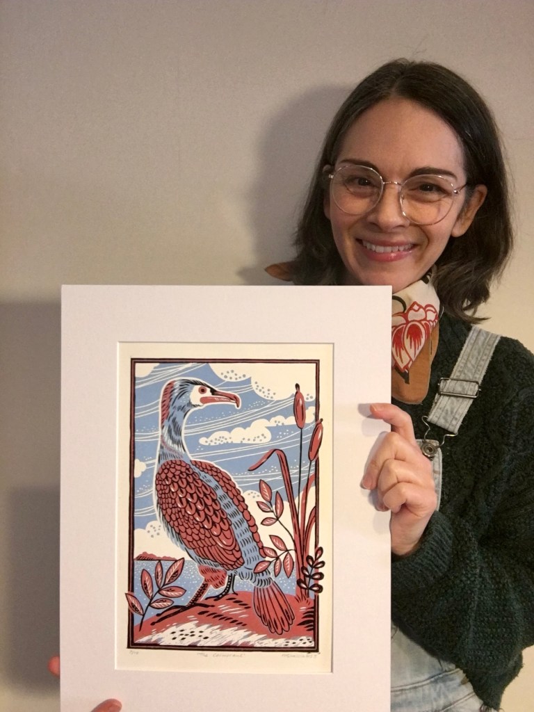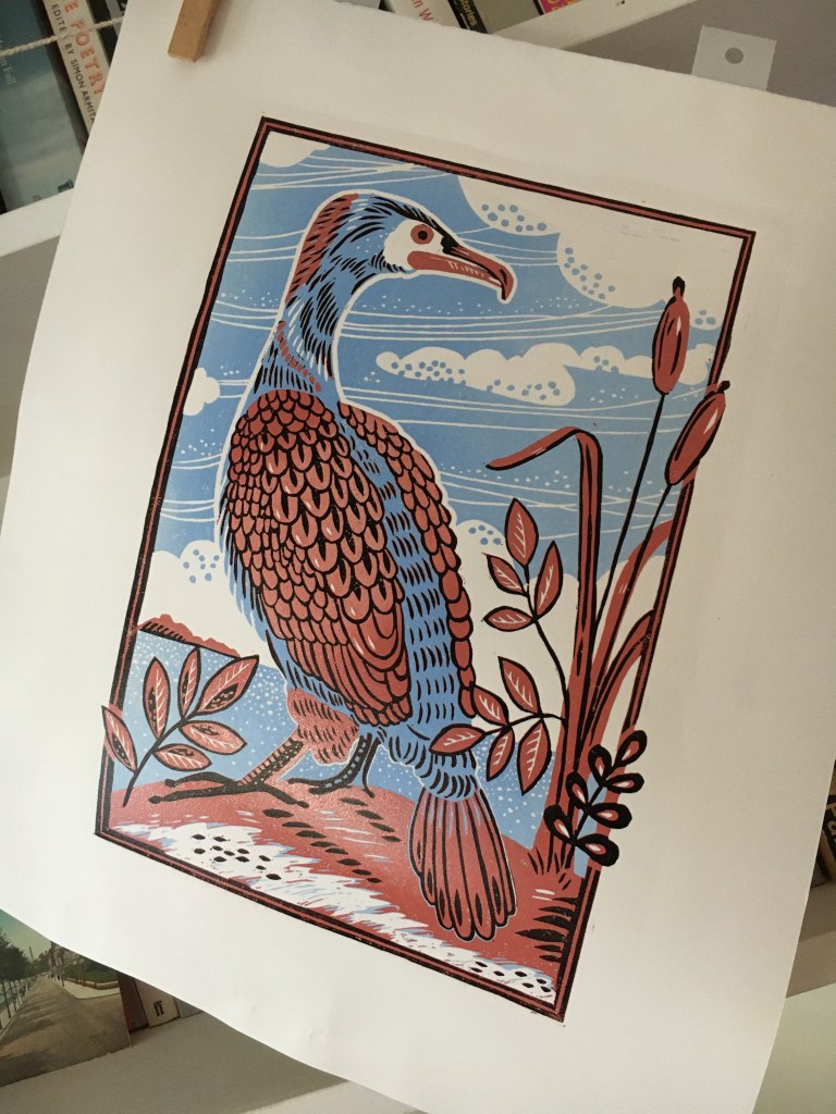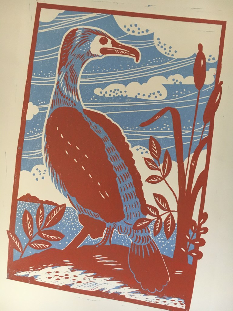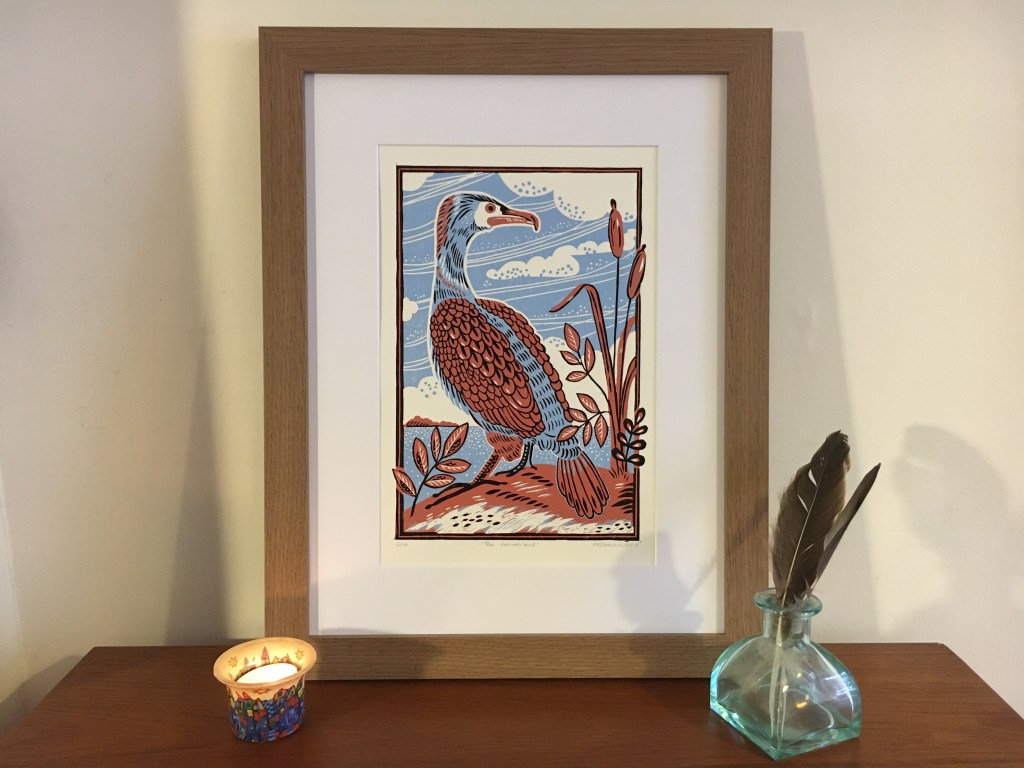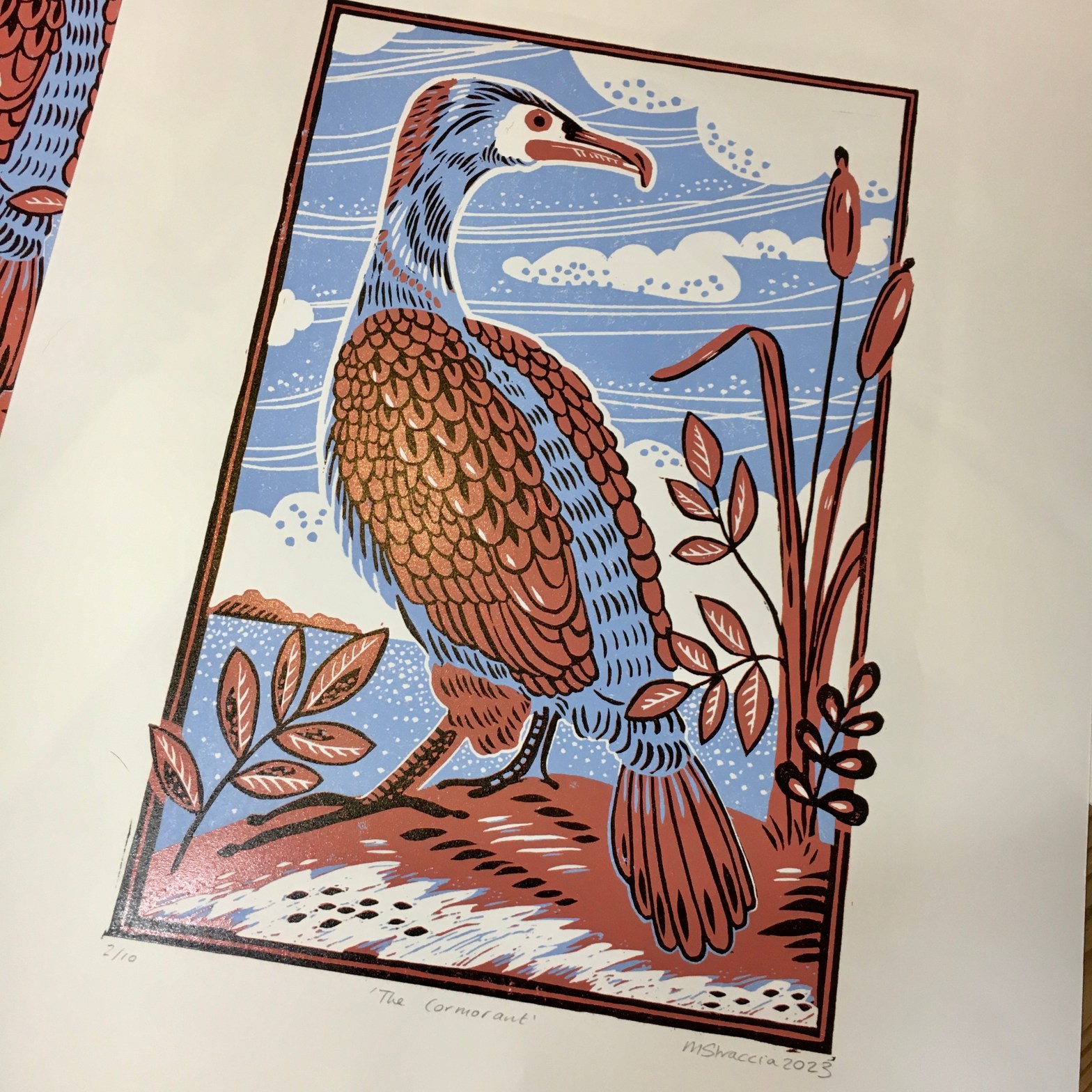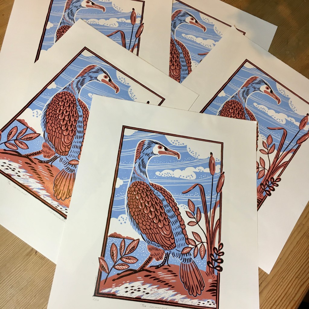 I decided to test it with my own cormorant design. I was inspired by this linocut by Richard Bawden. I frequently buy this design on a greeting card to give to friends who are also nature lovers and I love watching the cormorants near where I live at Bedford Priory Marina.
