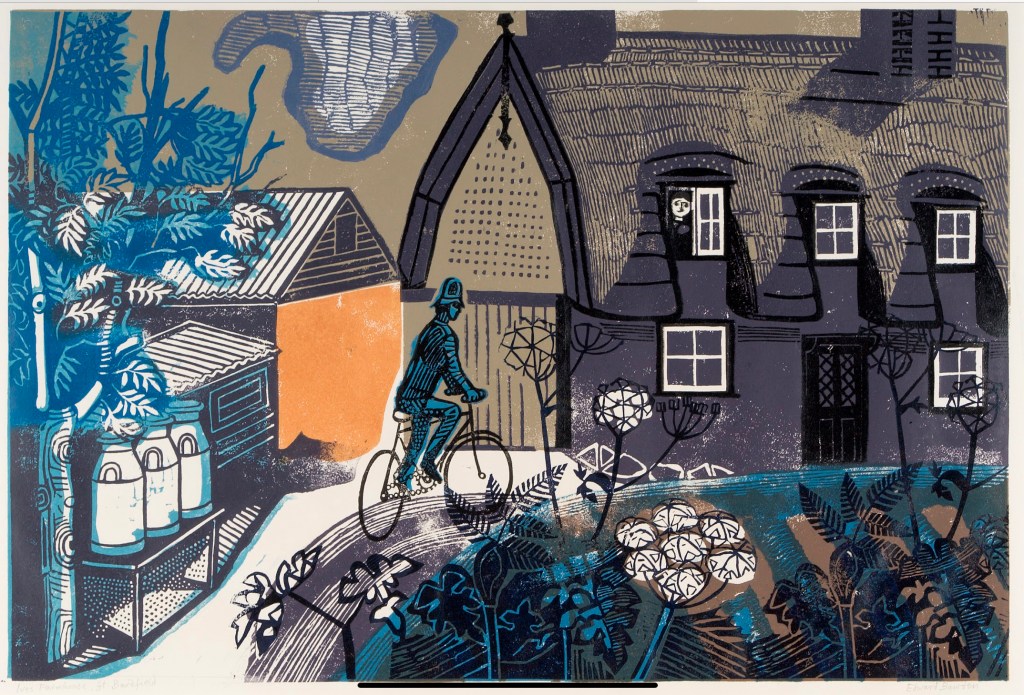 I have a postcard sized copy of Bawden’s linocut Road to Thaxted framed at home, so I was thrilled to see the real thing. I’m impressed with how Bawden simplifies subjects whilst retaining their identity. I had never noticed the person in the window before. What’s their relationship with the policeman? Could I create a similar mystery?