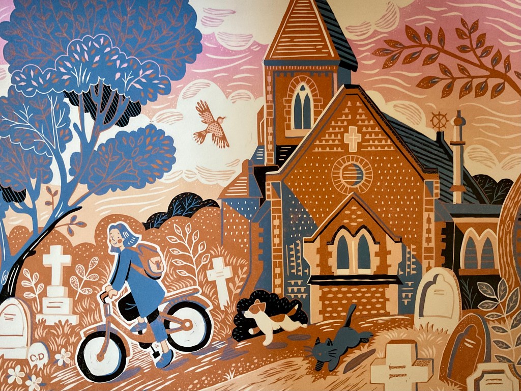 I do a lot of Illustration work for Foster Hill Road Cemetery, so I wanted to include the chapel in my work. You can watch a video of how I made this reduction linoprint. Each colour layer is printed by hand from the same piece of lino.