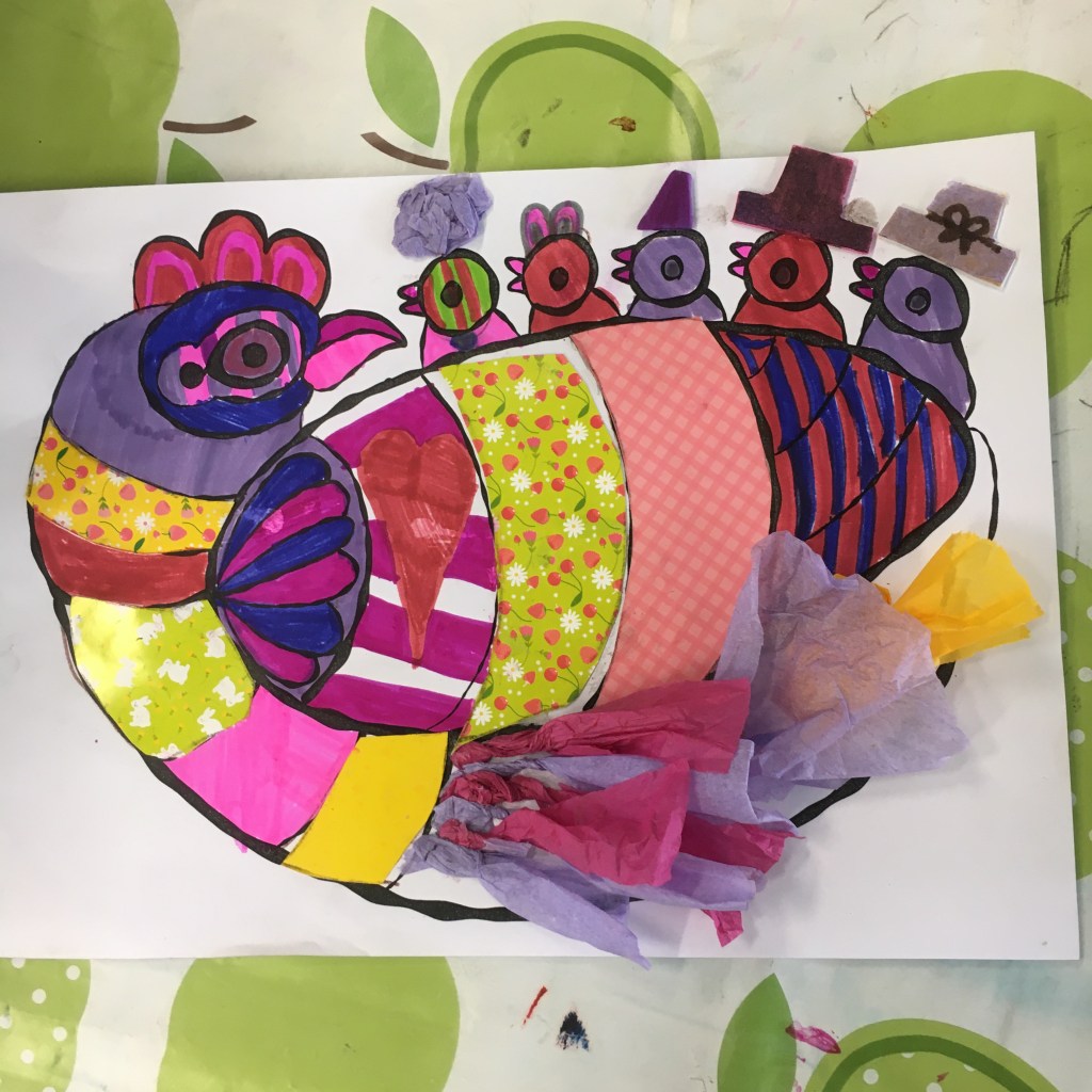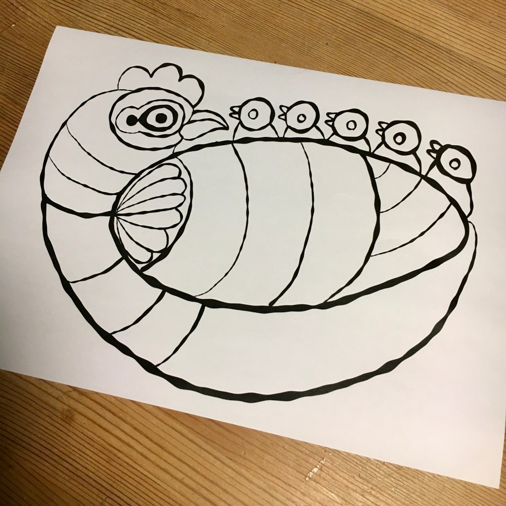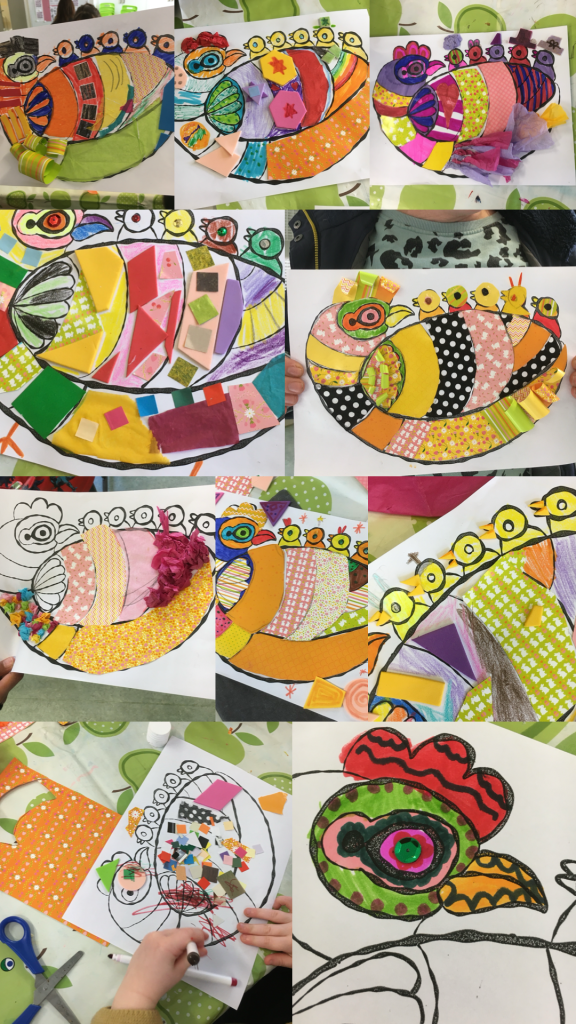 I decided to theme the crafternoon session on Easter and Bawden. I took one of his Easter designs for Fortnum and Mason and simplified it so crafters could add their own colour with creative collage. We encouraged everyone to add some personality to the chicks on the hen’s back too!