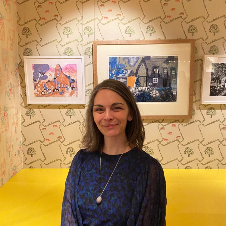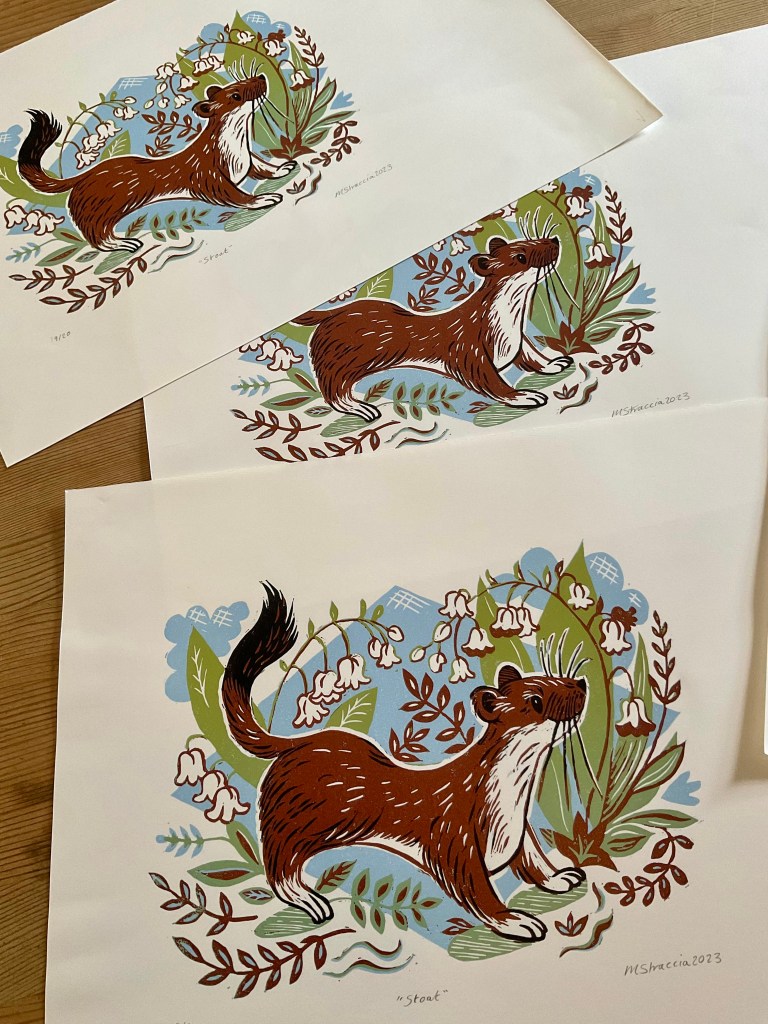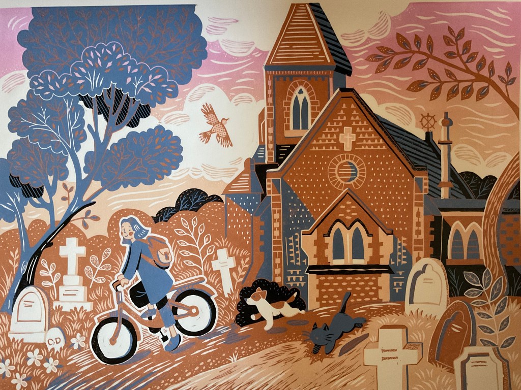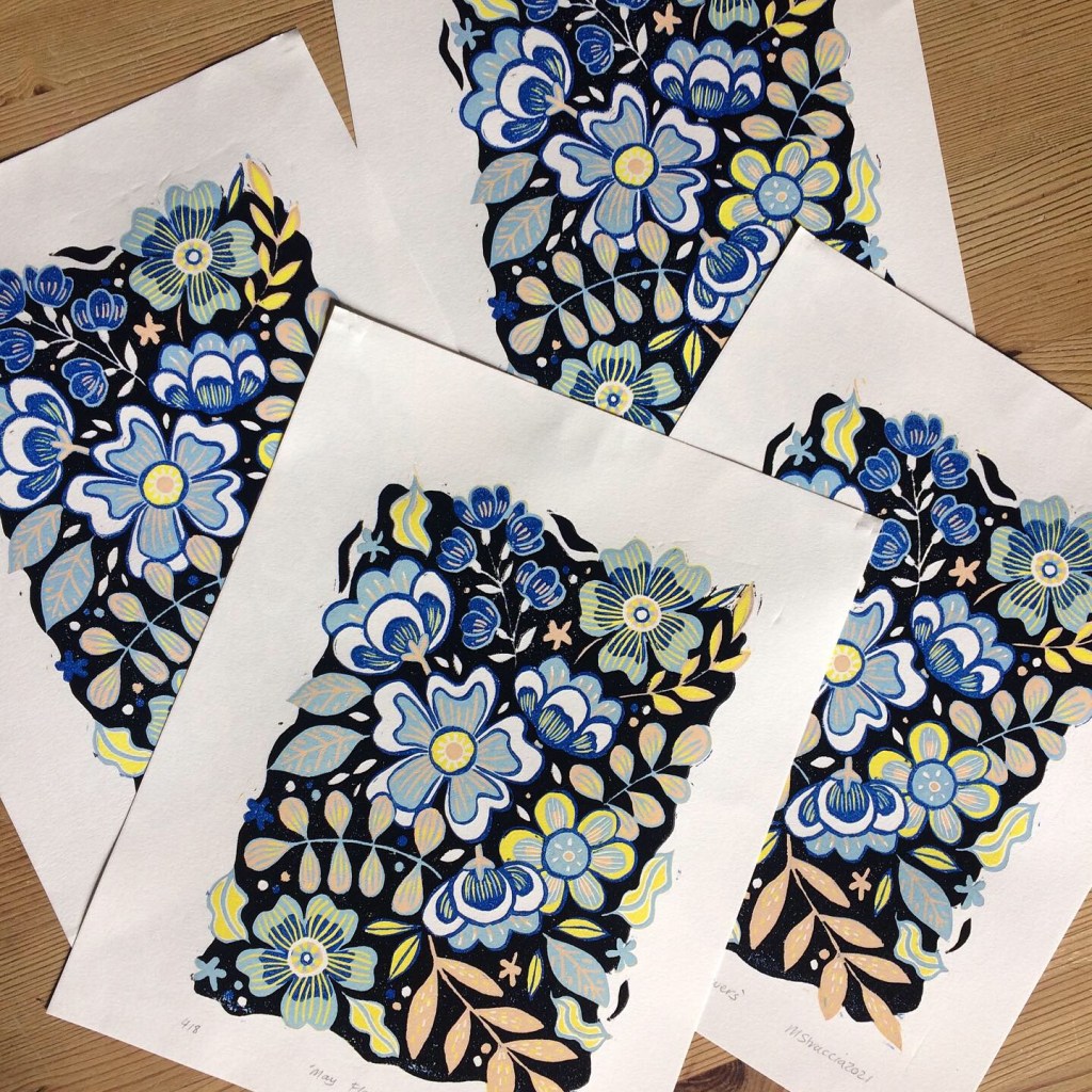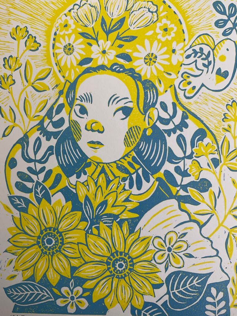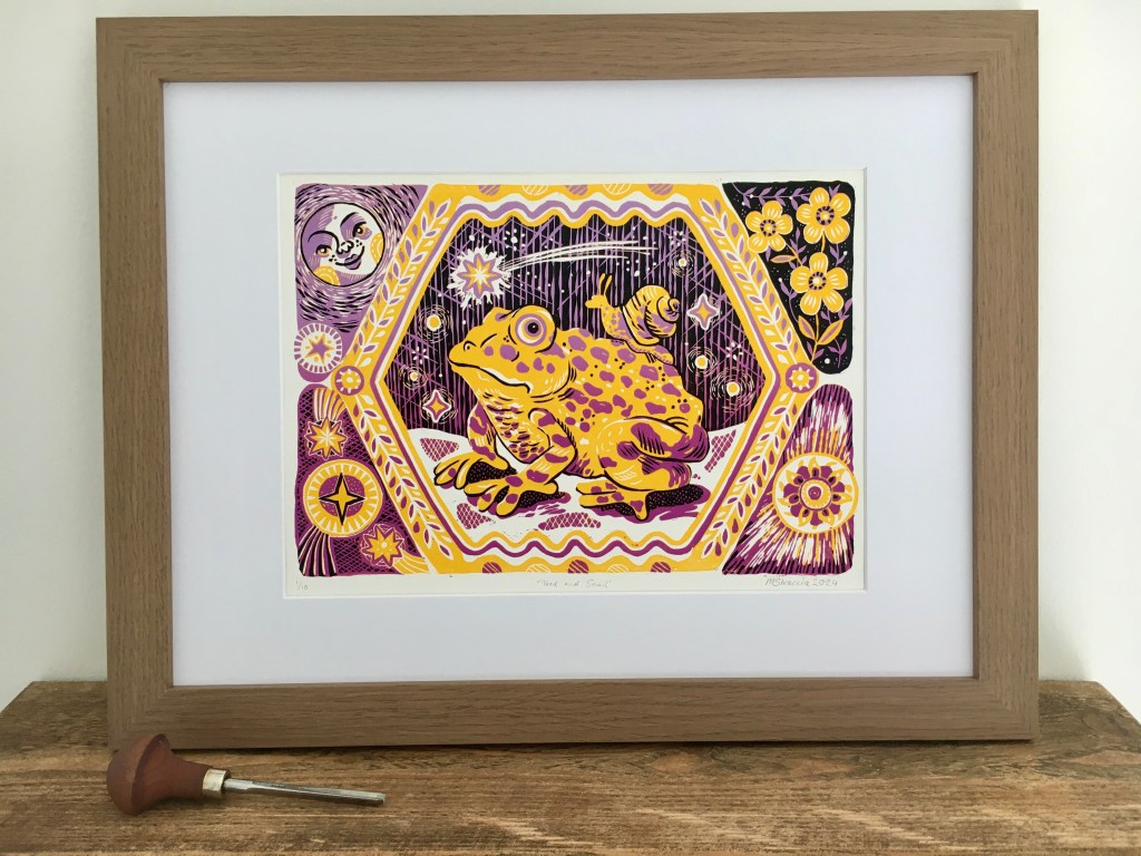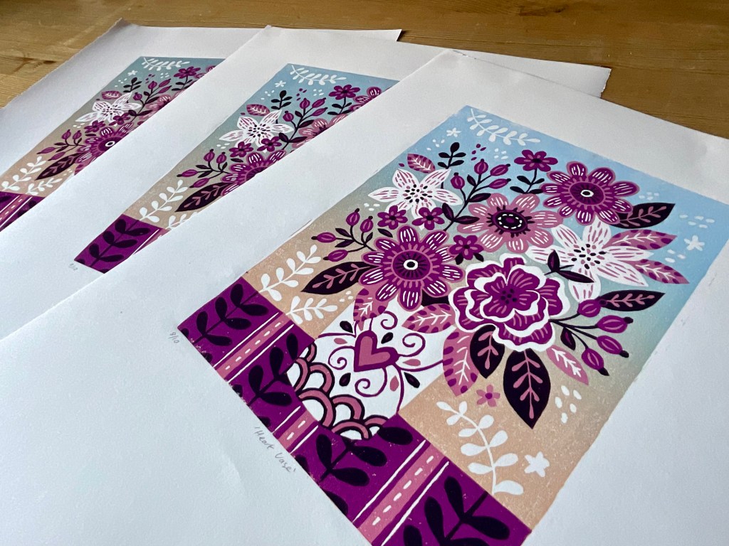 Her linocut printing is an act of folk art rebellion against screens. All her prints are made by hand and are her own designs. Her work process is deliberately low technology and energy efficient, creating work from her living room table with a baren and a back of a wooden spoon. This means every print in a series has little handmade variations in texture and impression. Every piece is unique.