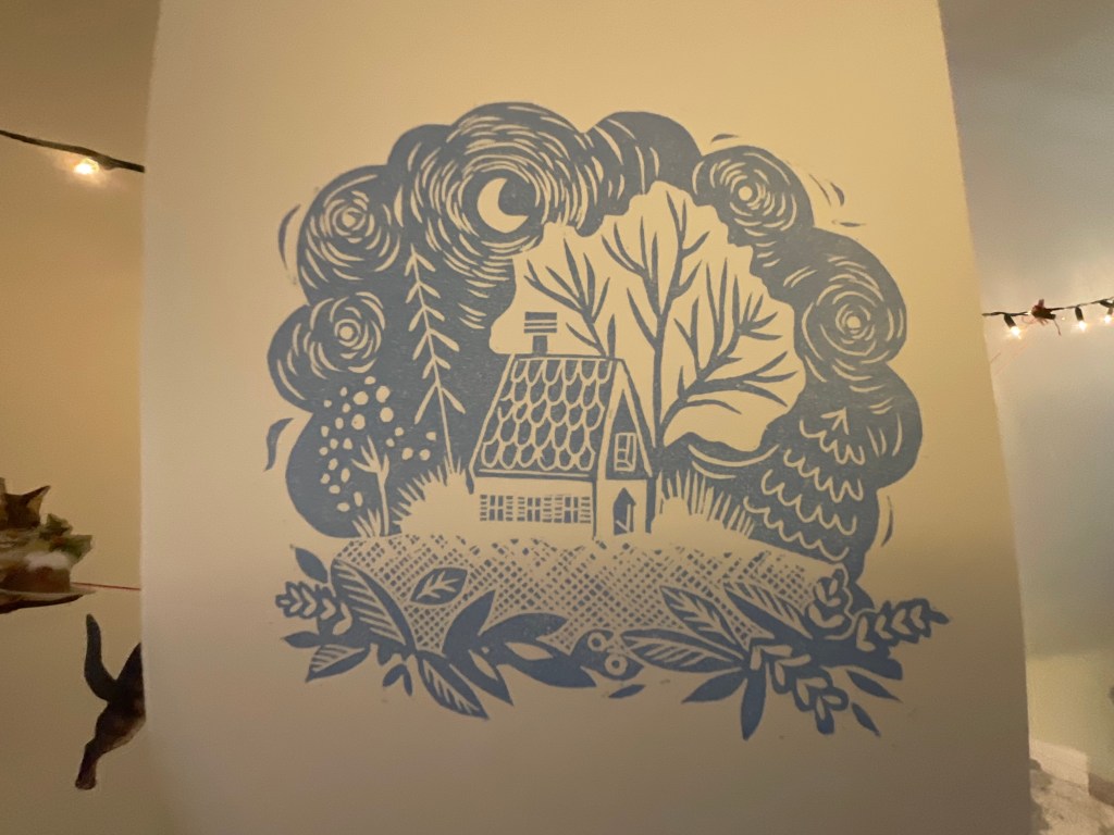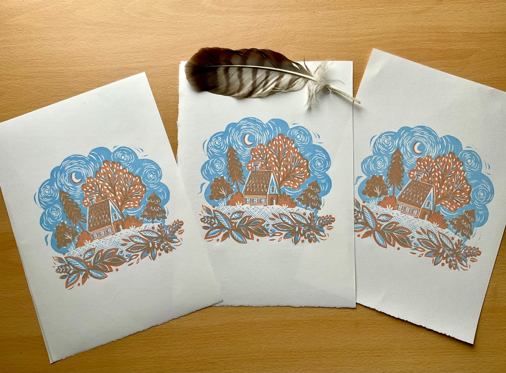 A few years ago a work colleague moved house, to a village in Lancashire. I made her a linocut print for her cosy new home in the countryside.