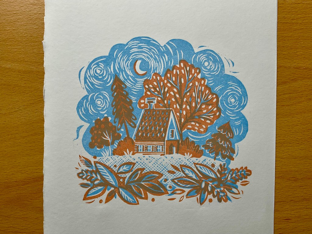 Instead of a reduction print I thought I would try a design using two pieces of lino scraps. I made two separate blocks, a blue and beige design of a cute little night time cottage. I added a lot of extender to my printing inks, so where the layers of colour overlap I get a third colour. Extender ink is basically normal printmakers ink without any pigment. This makes the ink more transparent. I used 50% colour ink and 50% extender in this mix.