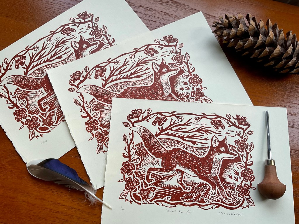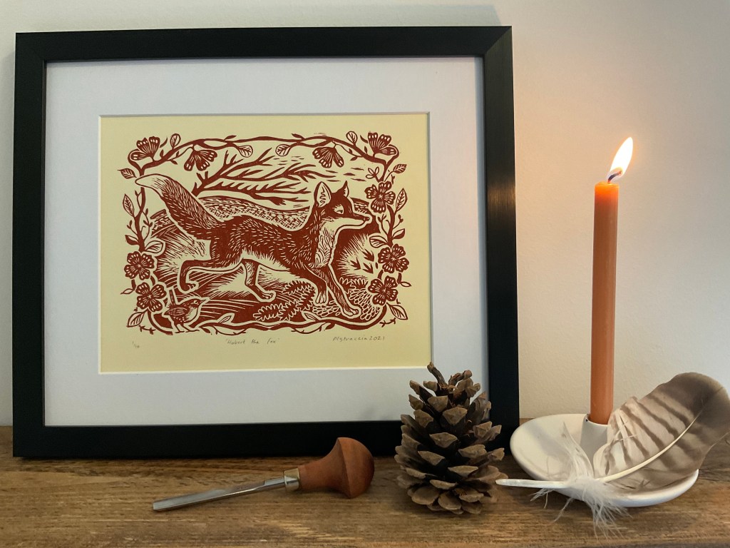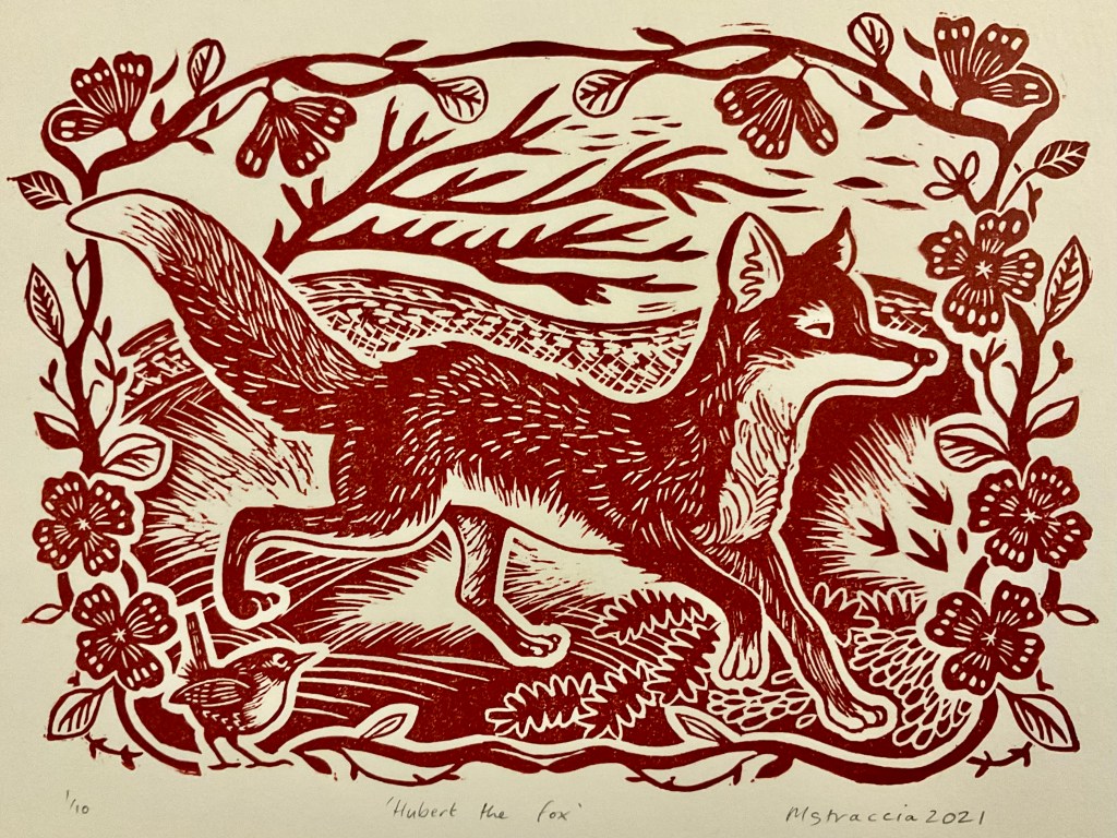 This countryside fox (Vulpes vulpes) design is my latest linocut print and my last print of 2021. It’s in a traditional arts and crafts inspired vintage style. I used burnt sienna ink on cream printer’s paper (zerkhall paper). I call him Hubert the Fox. He’s available to buy from my shop now.